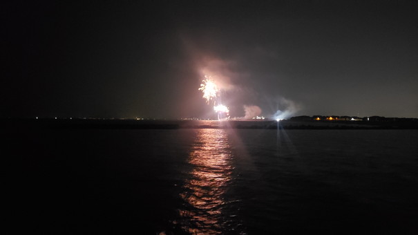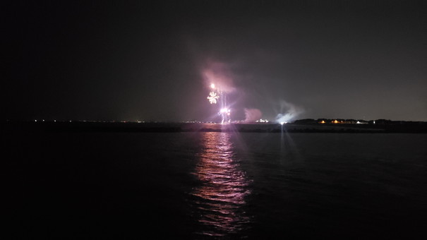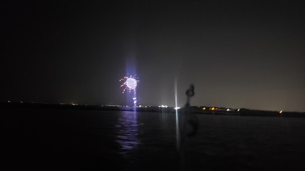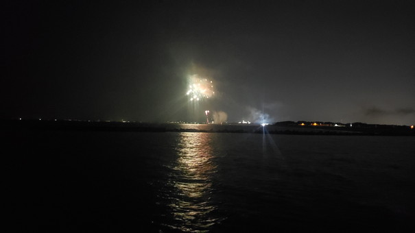 まさか夜釣りを楽しみながら、音楽と打ち上げ花火まで楽しめるなんて最高すぎる!(そして、相変わらず綺麗に撮れない花火)
